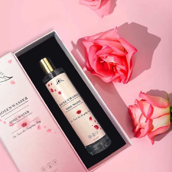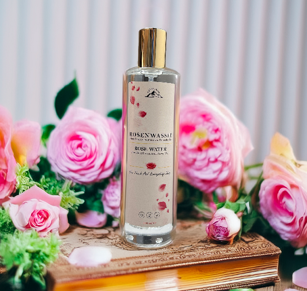 Rosenwasser ist ein feuchtigkeitsspendendes und beruhigendes Hautpflegeprodukt, das durch Dampfdestillation von Rosenblüten (Damaskus Rose) gewonnen wird.